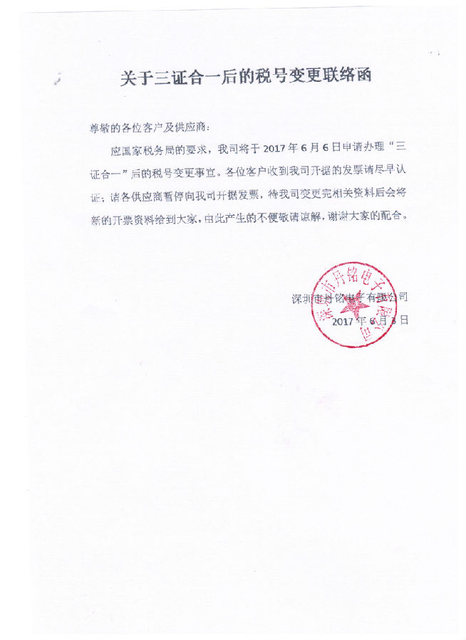 重要通知!!丹铭电子三证合一税号变更事项如下: